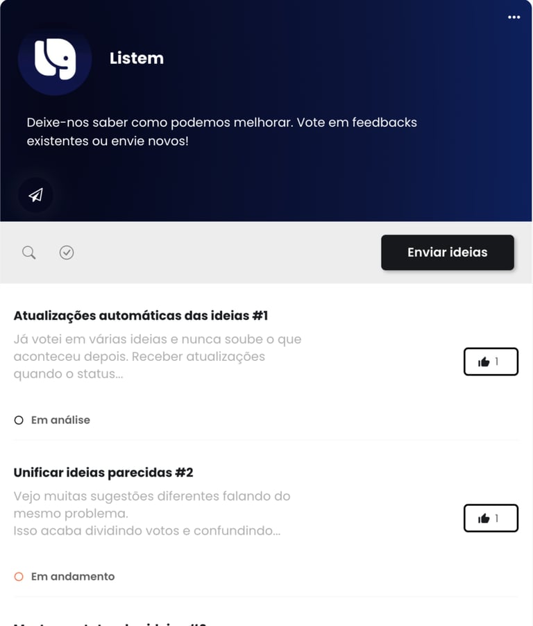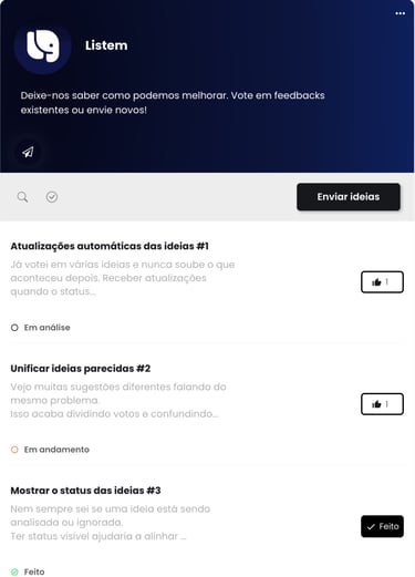 Listem é uma página que você compartilha com seus clientes para coletar, organizar e priorizar ideias reais com base em votos.